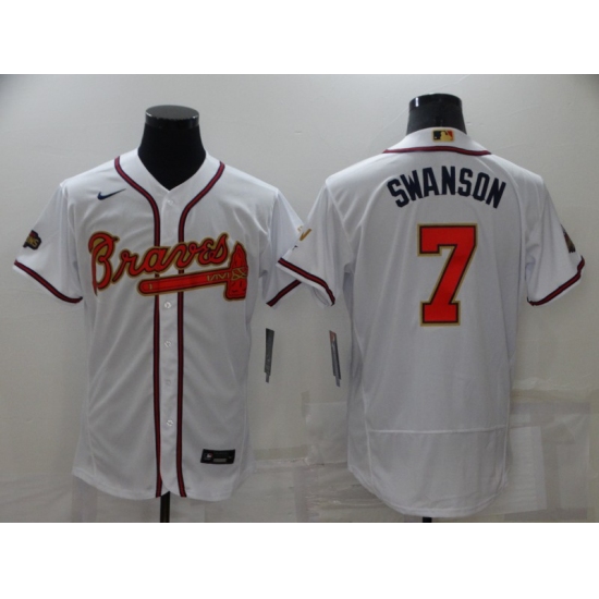 >Men's Atlanta Braves #7 Dansby Swanson White 2022 Gold Program Authentic Player Jersey
