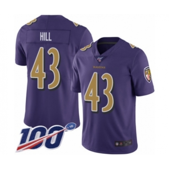 Men's Baltimore Ravens #43 Justice Hill Limited Purple Rush Vapor Untouchable 100th Season Football Jersey