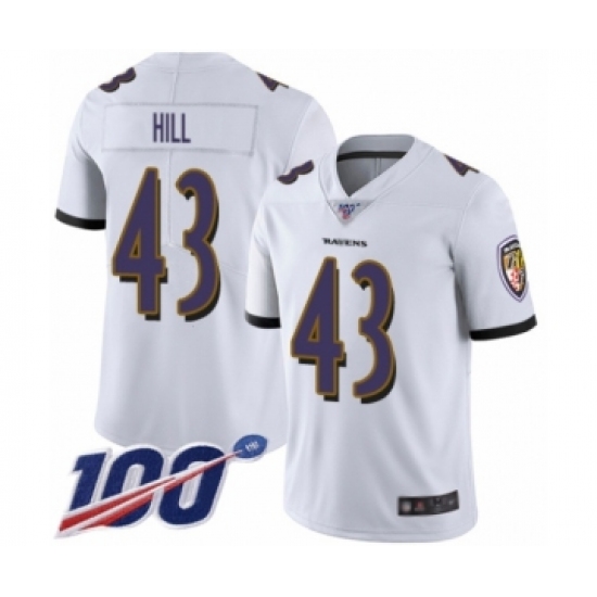 >Men's Baltimore Ravens #43 Justice Hill White Vapor Untouchable Limited Player 100th Season Football Jersey