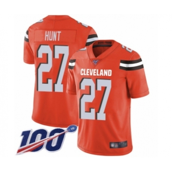 >Men's Cleveland Browns #27 Kareem Hunt Orange Alternate Vapor Untouchable Limited Player 100th Season Football Jersey