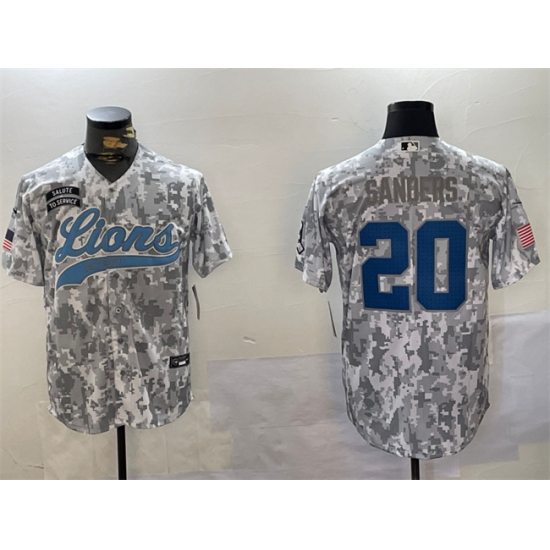 >Men's Detroit Lions #20 Barry Sanders 2024 Arctic Camo Salute To Service Stitched Baseball Jersey