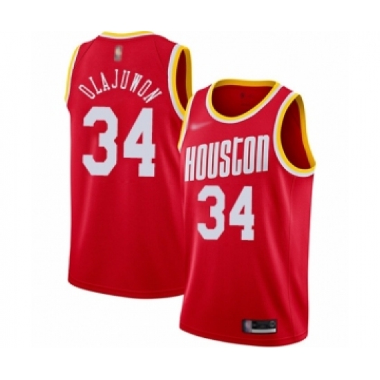 Men's Houston Rockets #34 Hakeem Olajuwon Authentic Red Hardwood Classics Finished Basketball JerseyMen's Houston Rockets #34 Hakeem Olajuwon Authentic Red