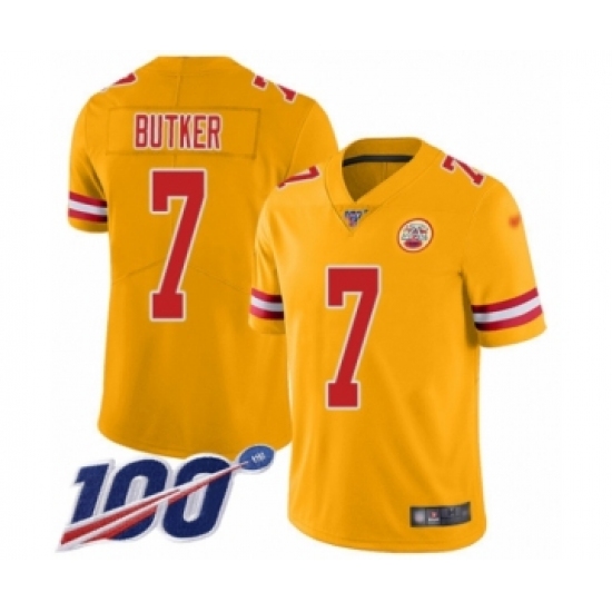 >Men's Kansas City Chiefs #7 Harrison Butker Limited Gold Inverted Legend 100th Season Football Jersey