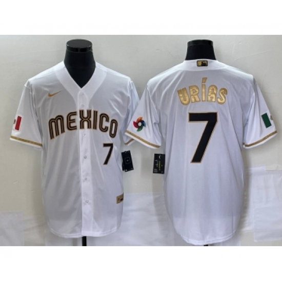 Men's Mexico Baseball #7 Julio Urias Number 2023 White Gold World Baseball Classic Stitched Jersey
