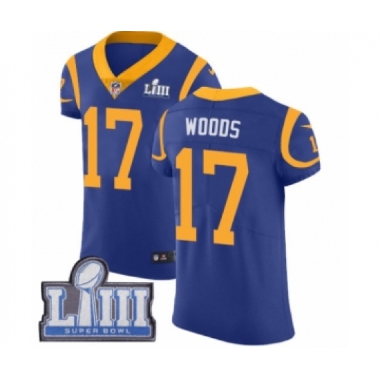 >Men's Nike Los Angeles Rams #17 Robert Woods Royal Blue Alternate Vapor Untouchable Elite Player Super Bowl LIII Bound NFL Jersey