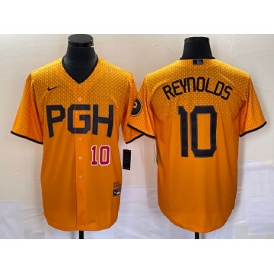 >Men's Nike Pittsburgh Pirates #10 Bryan Reynolds Number Gold 2023 City Connect Stitched Jersey