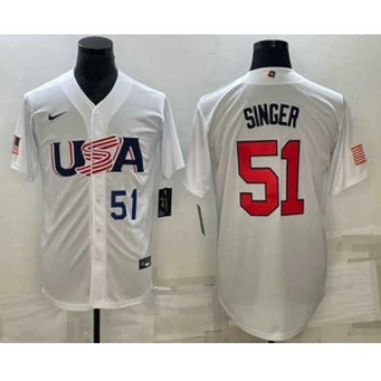 >Mens USA Baseball #51 Brady Singer Number 2023 White World Baseball Classic Stitched Jersey