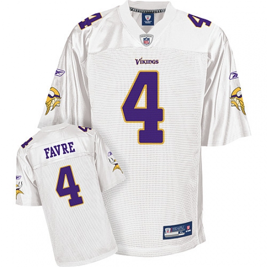 Feel like part of your favorite team by wearing this NFL® Reebok Minnesota Vikings #4 Brett Favre All White Authentic Throwback NFL Jersey, made of thick, high-quality Pro-Brite fabric for a genuine gridiron look. The players number which 100% stitched is displayed in tackle twill on the chest, back and sleeves, along with the team name on the front. The players name which 100% stitched is displayed on a sewn-down nameplate at the back. 100% Pro-Brite nylon and 100% Pro-Brite polyester for body, 100% lycratalic spandex dazzle for Side Panels/Collar/Cuffs, NFL® Equipment patch sewn on the bottom of the front collar or fabric insert, NFL® Equipment jock tag with numeric sizing is applied to the lower left bottom of the jersey, Reebok® logo embroidered on each sleeve, Officially licensed.