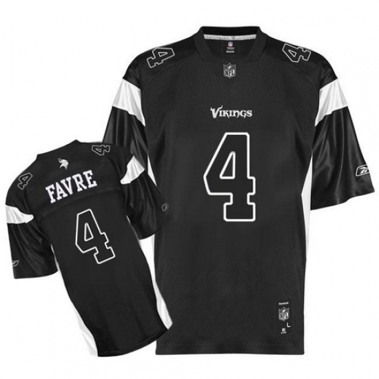 The Reebok Minnesota Vikings #4 Brett Favre Black Shadow Replica Throwback NFL Jersey by Reebok® is made with quick-drying nylon mesh and designed with screen-printed player and team graphics on the chest, back, sleeves and shoulders. 100% polyester diamond back mesh body, Polyester dazzle sleeves and yoke, Player's number screen-printed on the chest, back and sleeves, Player's name screen-printed at the upper back on a sewn down nameplate, Flat-knit collar with NFL® Equipment patch sewn at the point in the front, Woven jock tag shown at lower left front above the hem, Decorated in the team colors, Officially licensed .