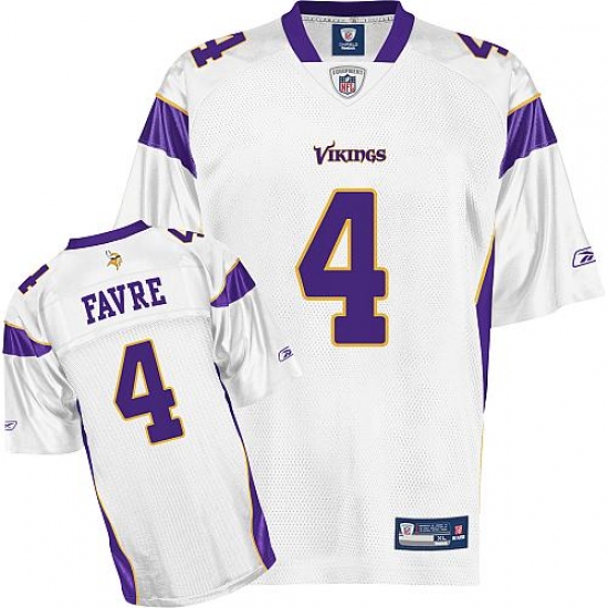 Feel like part of your favorite team by wearing this NFL® Reebok Minnesota Vikings #4 Brett Favre White Authentic Throwback NFL Jersey, made of thick, high-quality Pro-Brite fabric for a genuine gridiron look. The players number which 100% stitched is displayed in tackle twill on the chest, back and sleeves, along with the team name on the front. The players name which 100% stitched is displayed on a sewn-down nameplate at the back. 100% Pro-Brite nylon and 100% Pro-Brite polyester for body, 100% lycratalic spandex dazzle for Side Panels/Collar/Cuffs, NFL® Equipment patch sewn on the bottom of the front collar or fabric insert, NFL® Equipment jock tag with numeric sizing is applied to the lower left bottom of the jersey, Reebok® logo embroidered on each sleeve, Officially licensed.