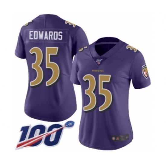 >Women's Baltimore Ravens #35 Gus Edwards Limited Purple Rush Vapor Untouchable 100th Season Football Jersey