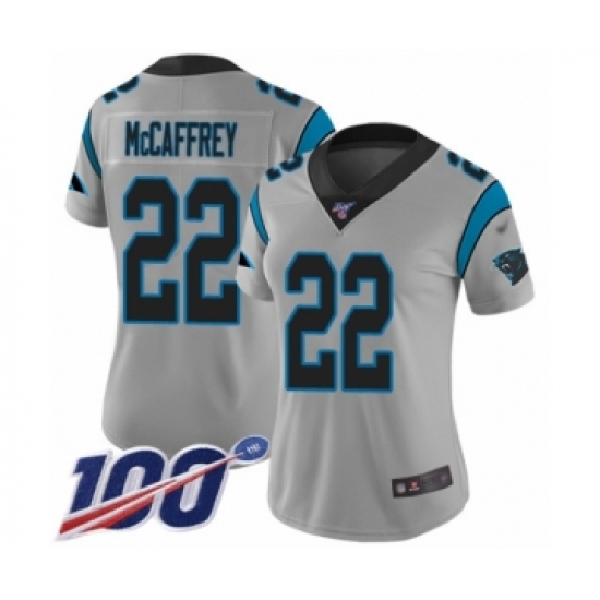 >Women's Carolina Panthers #22 Christian McCaffrey Silver Inverted Legend Limited 100th Season Football Jersey