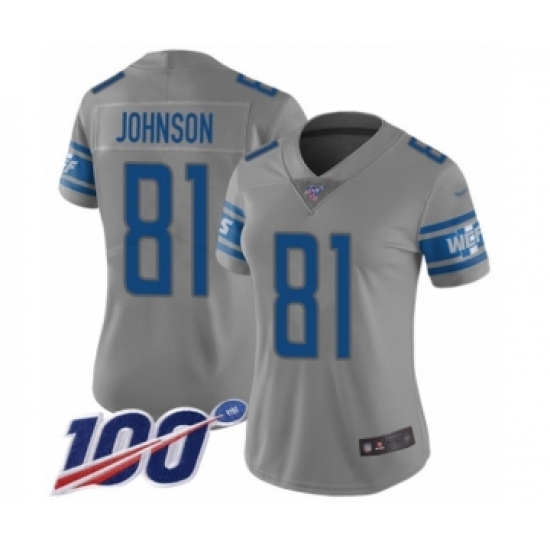 >Women's Detroit Lions #81 Calvin Johnson Limited Gray Inverted Legend 100th Season Football Jersey