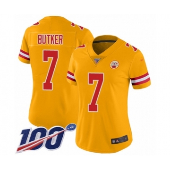 >Women's Kansas City Chiefs #7 Harrison Butker Limited Gold Inverted Legend 100th Season Football Jersey
