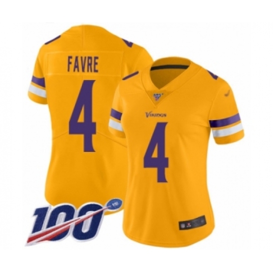 Women's Minnesota Vikings #4 Brett Favre Limited Gold Inverted Legend 100th Season Football Jersey