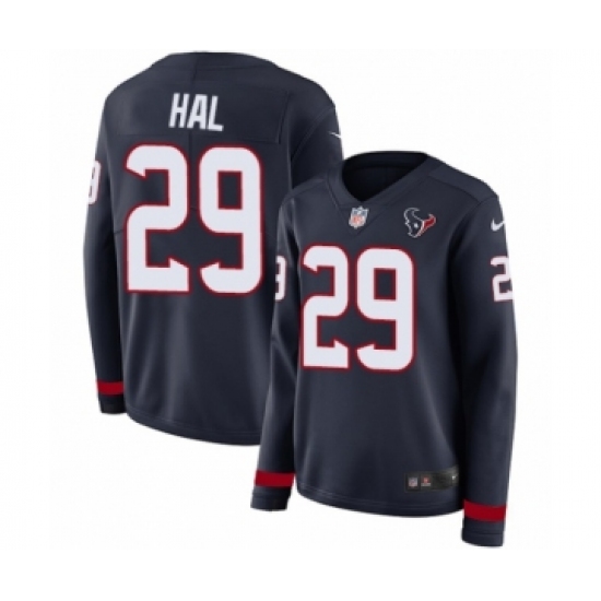 >Women's Nike Houston Texans #29 Andre Hal Limited Navy Blue Therma Long Sleeve NFL Jersey