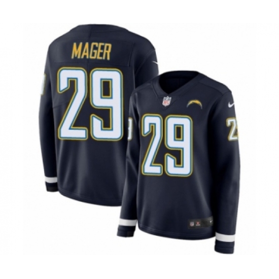 >Women's Nike Los Angeles Chargers #29 Craig Mager Limited Navy Blue Therma Long Sleeve NFL Jersey