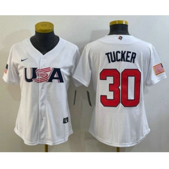>Women's USA Baseball #30 Kyle Tucker 2023 White World Classic Stitched Jersey
