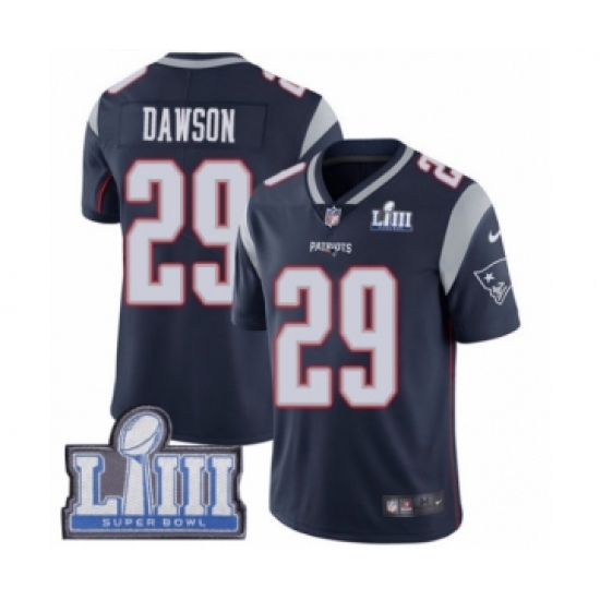 >Youth Nike New England Patriots #29 Duke Dawson Navy Blue Team Color Vapor Untouchable Limited Player Super Bowl LIII Bound NFL Jersey