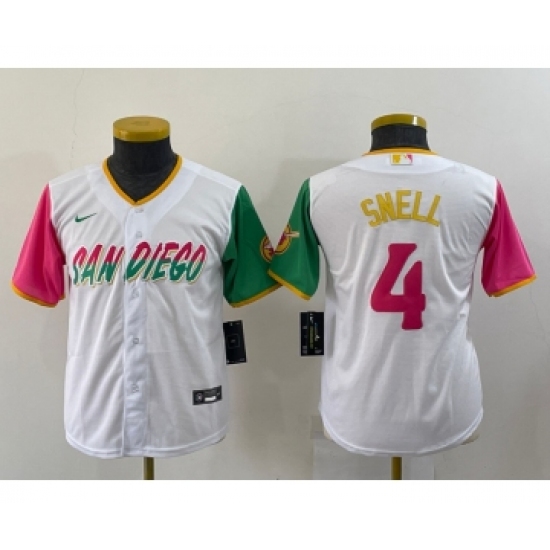 >Youth San Diego Padres #4 Blake Snell White 2022 City Connect Cool Base Stitched Jersey