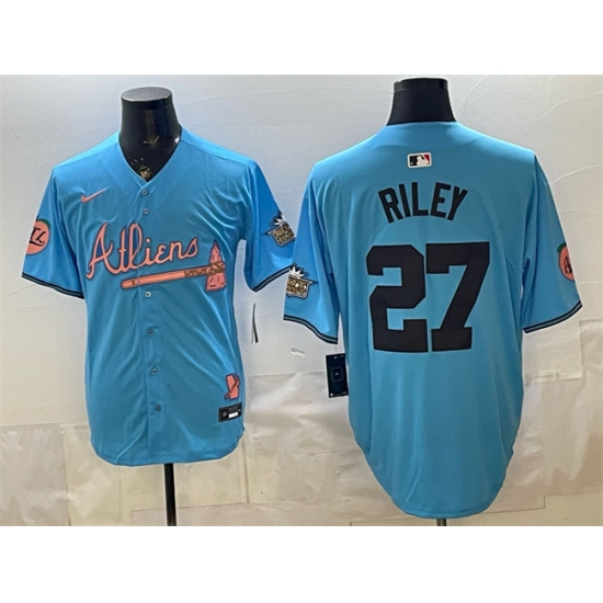 Men's Atlanta Braves #27 Austin Riley Blue 2024 Atliens & Peach With Outkast Vapor Limited Stitched Baseball Jersey