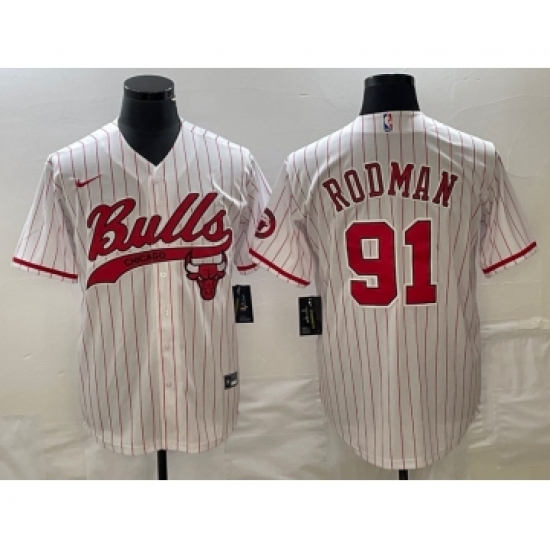 Men's Chicago Bulls #91 Dennis Rodman White Pinstripe Cool Base Stitched Baseball Jersey