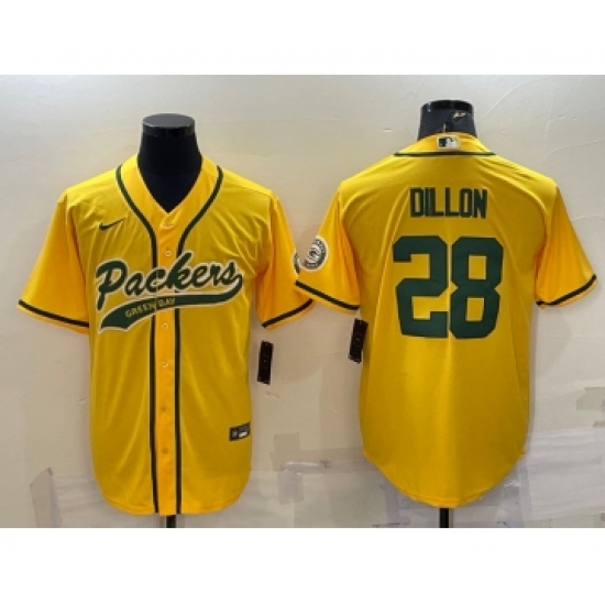 >Men's Green Bay Packers #28 AJ Dillon Yellow With Patch Cool Base Stitched Baseball Jersey