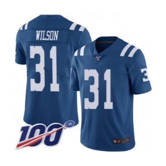 >Men's Indianapolis Colts #31 Quincy Wilson Limited Royal Blue Rush Vapor Untouchable 100th Season Football Jersey