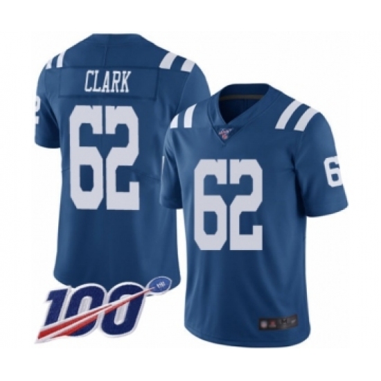 >Men's Indianapolis Colts #62 Le'Raven Clark Limited Royal Blue Rush Vapor Untouchable 100th Season Football Jersey