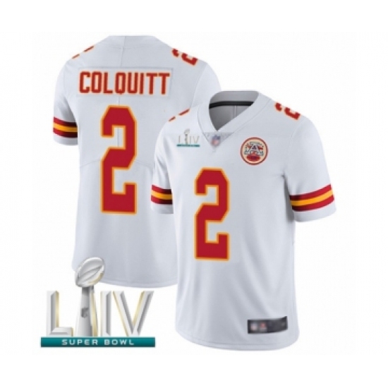 >Men's Kansas City Chiefs #2 Dustin Colquitt White Vapor Untouchable Limited Player Super Bowl LIV Bound Football Jersey