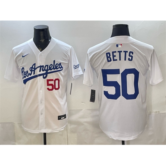 >Men's Los Angeles Dodgers #50 Mookie Betts White Alternate Stadium Stitched Baseball Jersey