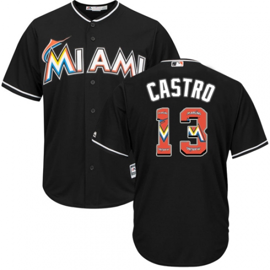 Home>MLB>Miami Marlins>Starlin Castro>Men's Majestic Miami Marlins #13 Starlin Castro Authentic Black Team Logo Fashion Cool Base MLB Jersey