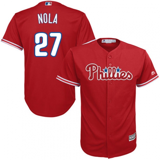 Home>MLB>Philadelphia Phillies>Aaron Nola>Men's Majestic Philadelphia Phillies #27 Aaron Nola Replica Red Alternate Cool Base MLB Jersey