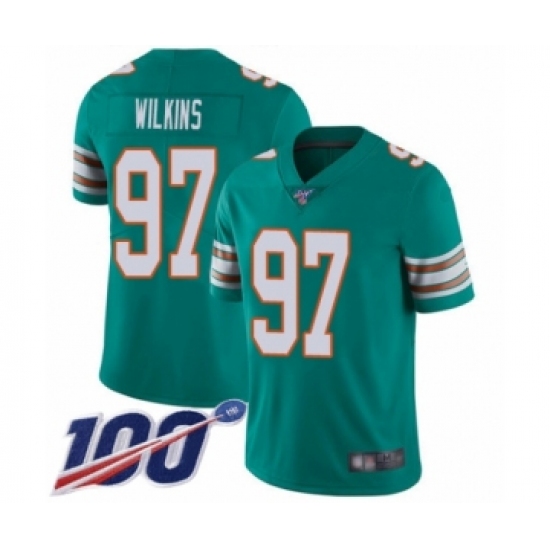 >Men's Miami Dolphins #97 Christian Wilkins Aqua Green Alternate Vapor Untouchable Limited Player 100th Season Football Jersey