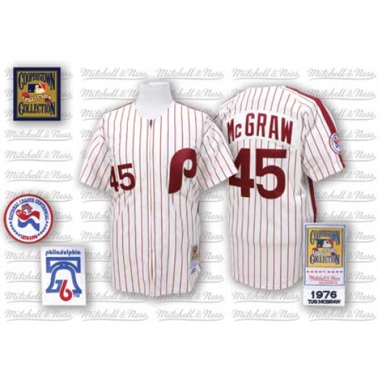 Men's Mitchell and Ness Philadelphia Phillies #45 Tug McGraw Replica White/Red Strip Throwback MLB Jersey