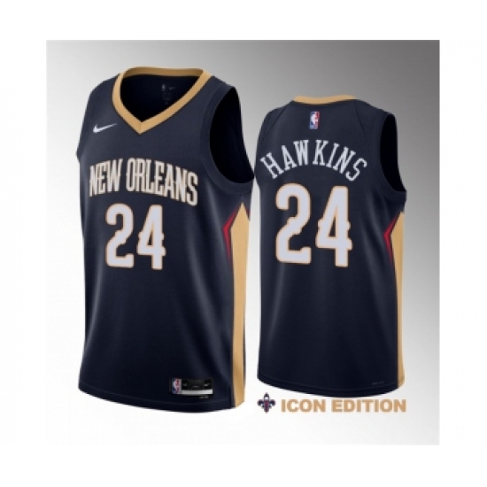 >Men's New Orleans Pelicans #24 Jordan Hawkins Navy 2023 Draft Icon Edition Stitched Basketball Jersey