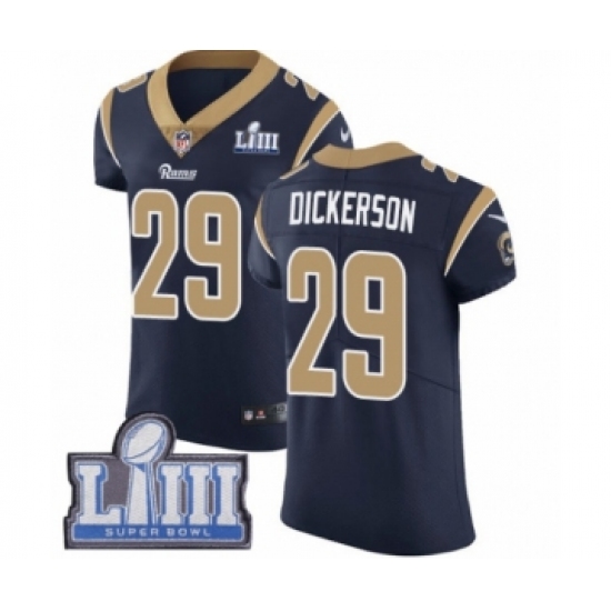 >Men's Nike Los Angeles Rams #29 Eric Dickerson Navy Blue Team Color Vapor Untouchable Elite Player Super Bowl LIII Bound NFL Jersey
