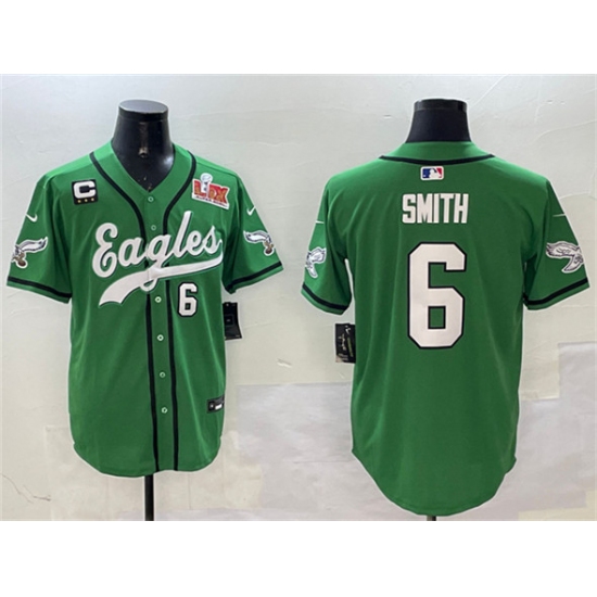 >Men's Philadelphia Eagles #6 DeVonta Smith Green 2025 Super Bowl LIX And 3-Star C Stitched Baseball Jersey