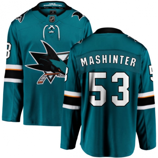 Home>NHL>San Jose Sharks>Brandon Mashinter>Men's San Jose Sharks #53 Brandon Mashinter Fanatics Branded Teal Green Home Breakaway NHL Jersey