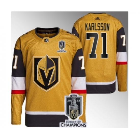 >Men's Vegas Golden Knights #71 William Karlsson Gold 2023 Stanley Cup Champions Stitched Jersey