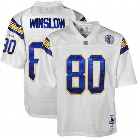 Feel like part of your favorite team by wearing this NFL® Mitchell And Ness Los Angeles Chargers #80 Kellen Winslow Authentic White 1984 Throwback NFL Jersey, made of thick, high-quality Pro-Brite fabric for a genuine gridiron look. The players number which 100% stitched is displayed in tackle twill on the chest, back and sleeves, along with the team name on the front. The players name which 100% stitched is displayed on a sewn-down nameplate at the back. 100% Pro-Brite nylon and 100% Pro-Brite polyester for body, 100% lycratalic spandex dazzle for Side Panels/Collar/Cuffs, NFL® Equipment patch sewn on the bottom of the front collar or fabric insert, NFL® Equipment jock tag with numeric sizing is applied to the lower left bottom of the jersey, Reebok® logo embroidered on each sleeve, Officially licensed