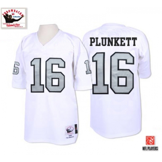 Feel like part of your favorite team by wearing this NFL® Mitchell and Ness Oakland Raiders #16 Jim Plunkett White with Silver No. Authentic NFL Throwback Jersey, made of thick, high-quality Pro-Brite fabric for a genuine gridiron look. The players number which 100% stitched is displayed in tackle twill on the chest, back and sleeves, along with the team name on the front. The players name which 100% stitched is displayed on a sewn-down nameplate at the back. 100% Pro-Brite nylon and 100% Pro-Brite polyester for body, 100% lycratalic spandex dazzle for Side Panels/Collar/Cuffs, NFL® Equipment patch sewn on the bottom of the front collar or fabric insert, NFL® Equipment jock tag with numeric sizing is applied to the lower left bottom of the jersey, Officially licensed