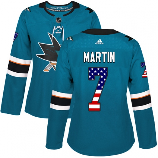 Home>NHL>San Jose Sharks>Paul Martin>Women's Adidas San Jose Sharks #7 Paul Martin Authentic Teal Green USA Flag Fashion NHL Jersey