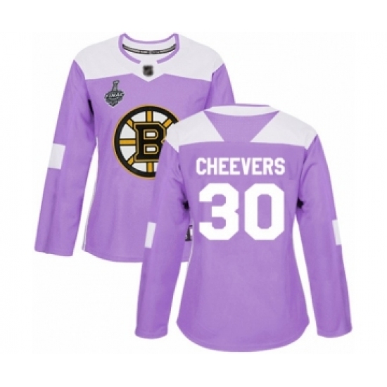 >Women's Boston Bruins #30 Gerry Cheevers Authentic Purple Fights Cancer Practice 2019 Stanley Cup Final Bound Hockey Jersey