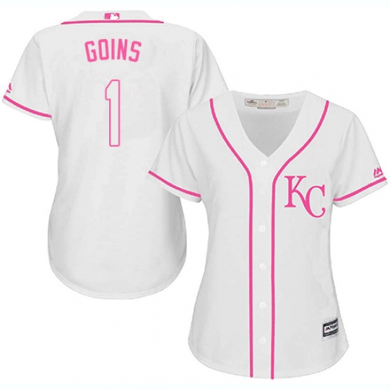Home>MLB>Kansas City Royals>Ryan Goins>Women's Majestic Kansas City Royals #1 Ryan Goins Authentic White Fashion Cool Base MLB Jersey
