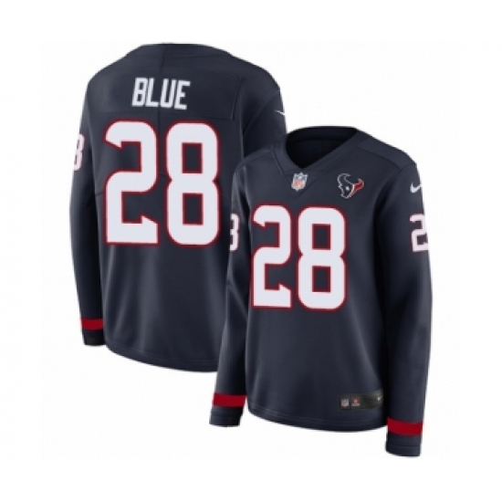 >Women's Nike Houston Texans #28 Alfred Blue Limited Navy Blue Therma Long Sleeve NFL Jersey