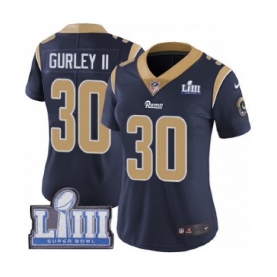 >Women's Nike Los Angeles Rams #30 Todd Gurley Navy Blue Team Color Vapor Untouchable Limited Player Super Bowl LIII Bound NFL Jersey