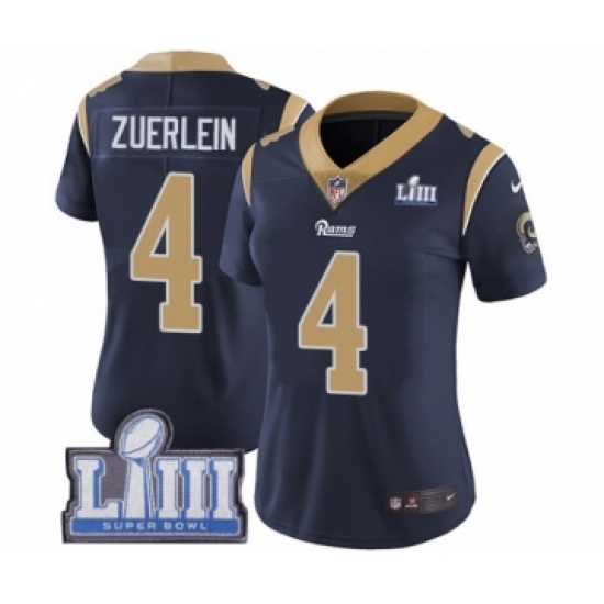 Women's Nike Los Angeles Rams #4 Greg Zuerlein Navy Blue Team Color Vapor Untouchable Limited Player Super Bowl LIII Bound NFL Jersey
