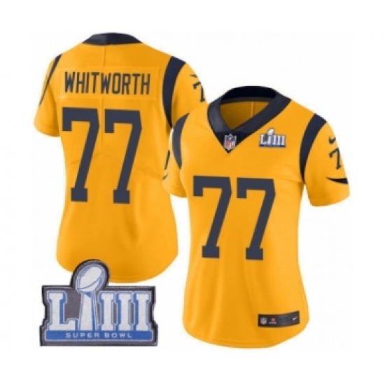 >Women's Nike Los Angeles Rams #77 Andrew Whitworth Limited Gold Rush Vapor Untouchable Super Bowl LIII Bound NFL Jersey
