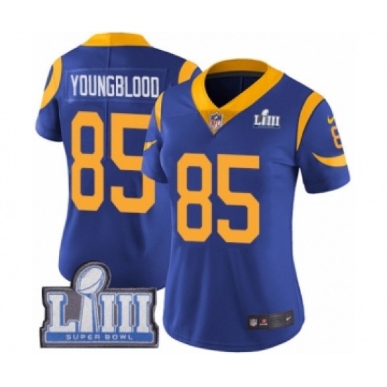>Women's Nike Los Angeles Rams #85 Jack Youngblood Royal Blue Alternate Vapor Untouchable Limited Player Super Bowl LIII Bound NFL Jersey